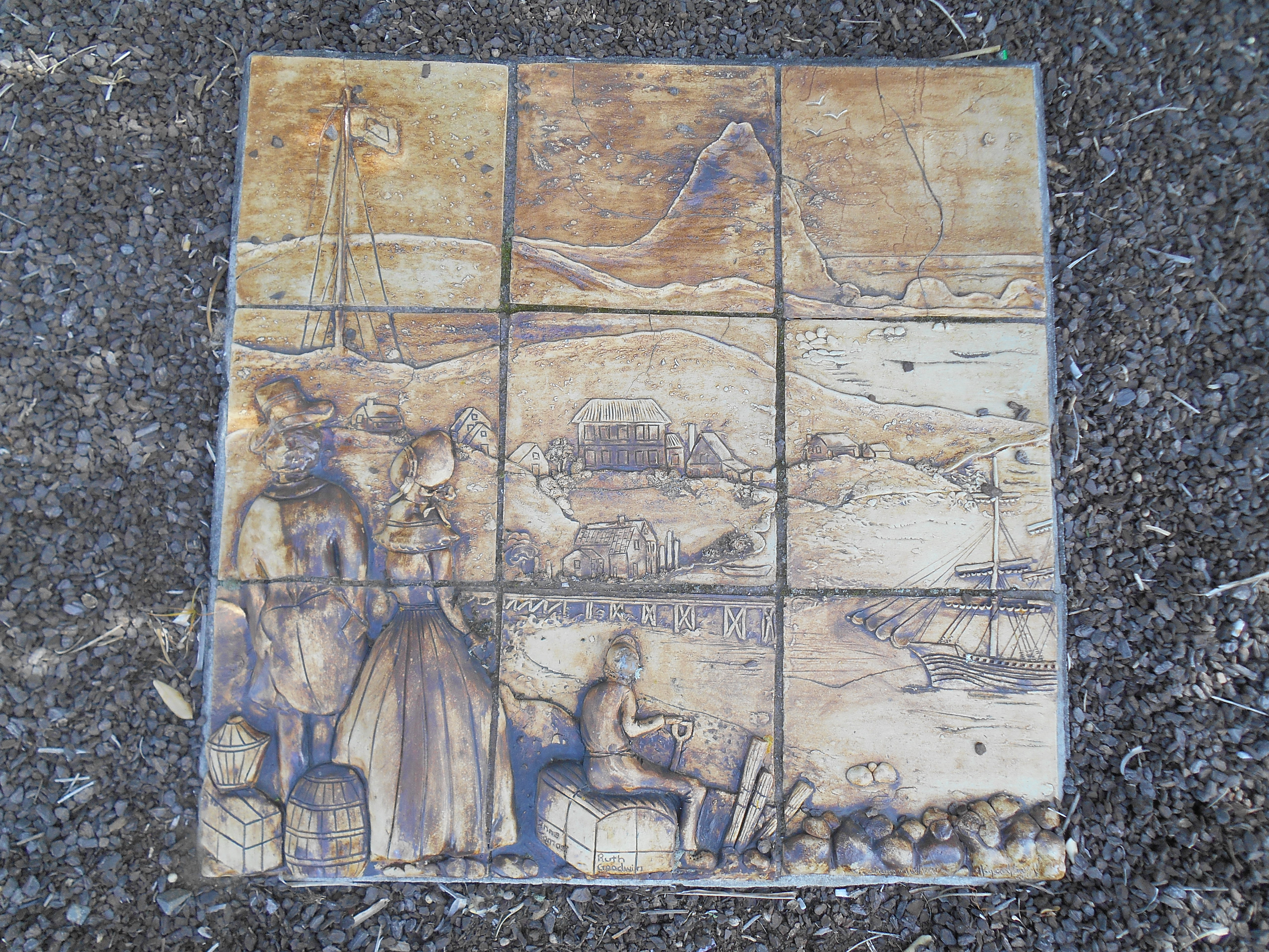 These six ceramic plaques represent the various periods of the history of the Huatoki Stream mouth. They were created by the New Plymouth Potters Society for the New Plymouth Sesquicentennial in 1991 and used to be on a wall closer to the Huatoki Stream. Puke Ariki Landing was re-developed in about 2004 after Puke Ariki was built and the plaques were relocated to the sloping area right in front of the museum, under the nīkau trees.