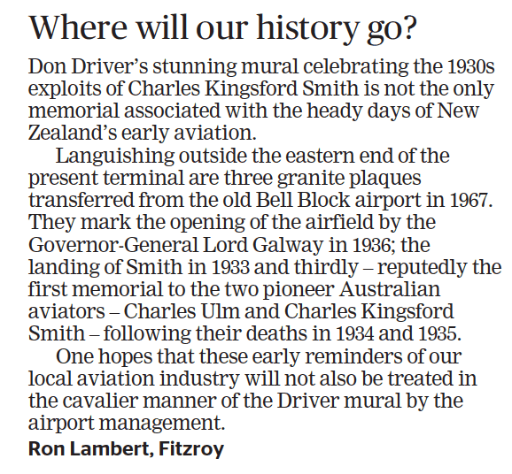 Don Driver's 50-year-old Kingsford Smith sculpture may not have a place in upgraded NP airport (Taranaki Daily News 15 June 2017)