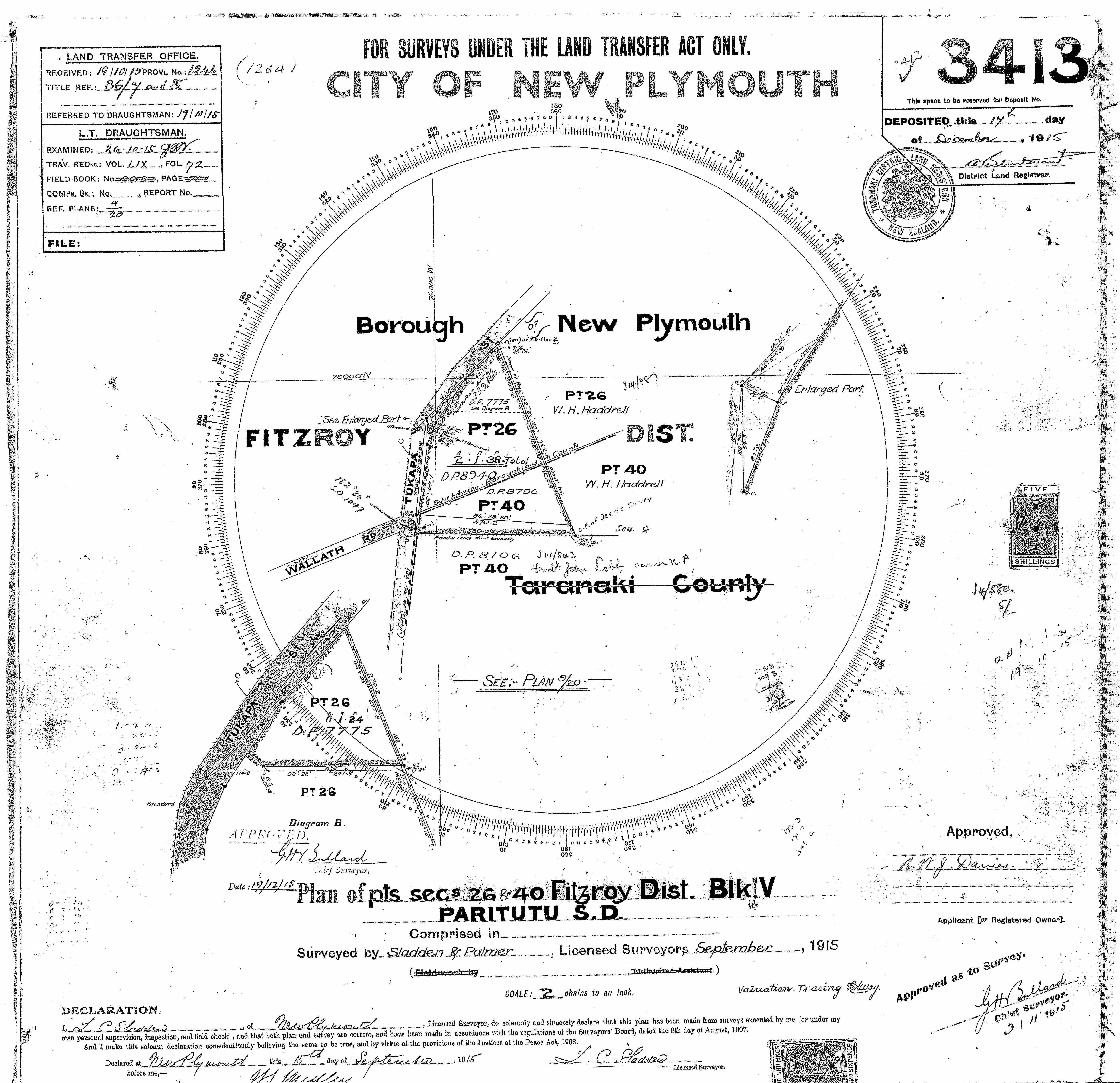 Taranaki DP3413 Sheet 1 (1915), ICS Pre 300,000 Cadastral Plan Index (Imaged by LINZ)