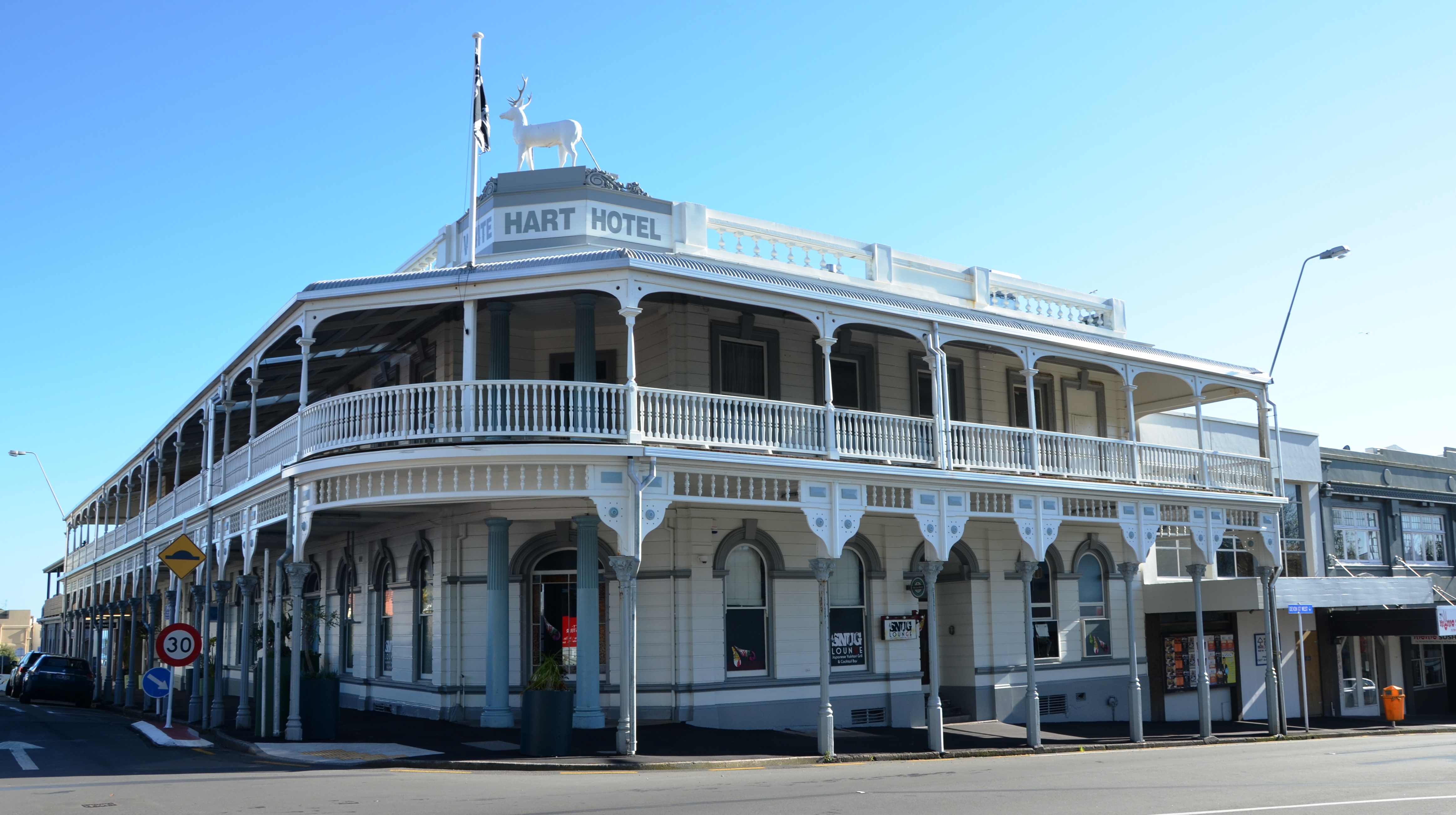 The White Hart Hotel is located on the corner of Devon Street West and Queen Street. It was built in 1887 and has withstood the test of time to become a New Plymouth landmark.