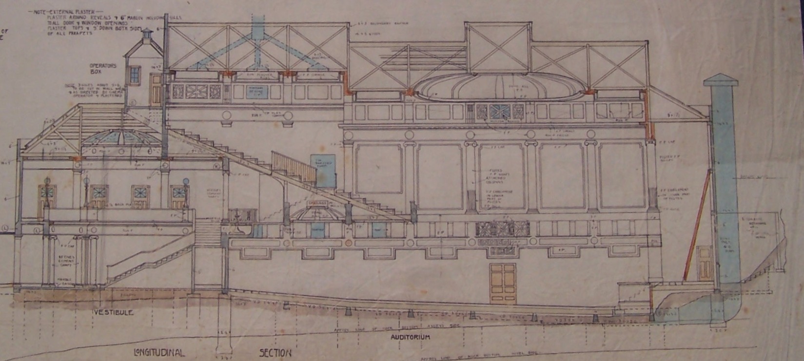 The Everybody's Theatre Auditorium, commissioned by the local company Taranaki Amusements Ltd, in Devon Street West was built in 1916. Newly-arrived in town, architect Thomas Bates' first job was supervising the construction the theatre on behalf of Auckland architects, Grierson and Aimer's. The contractors were Messrs Chappell & Woolley, also from Auckland. A permit for the theatre was issued on 8 February 1916 and the estimated cost was £5,283. Plans in the Puke Ariki collection - ARC2004-645.